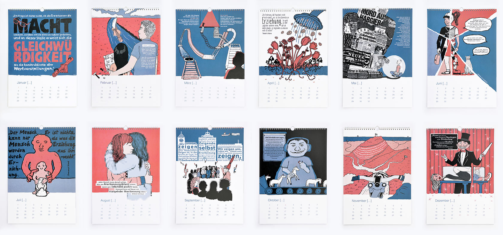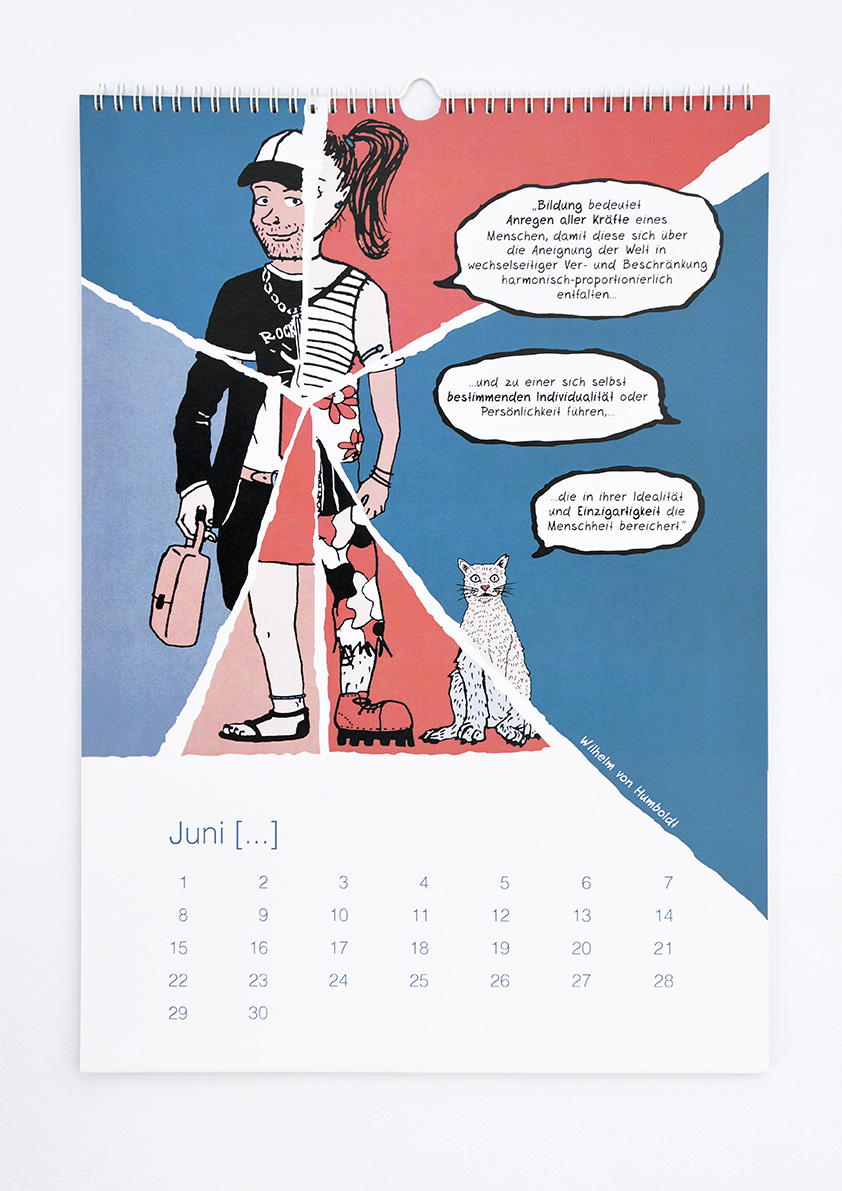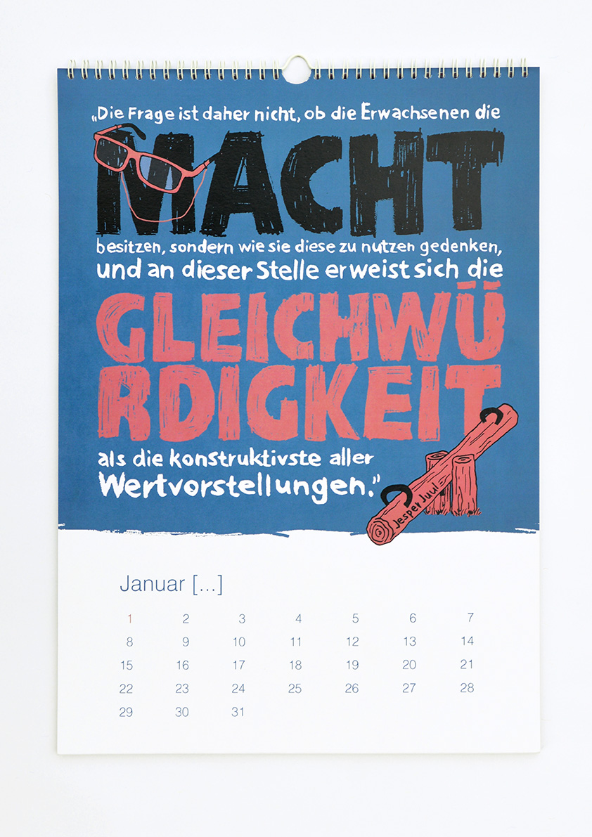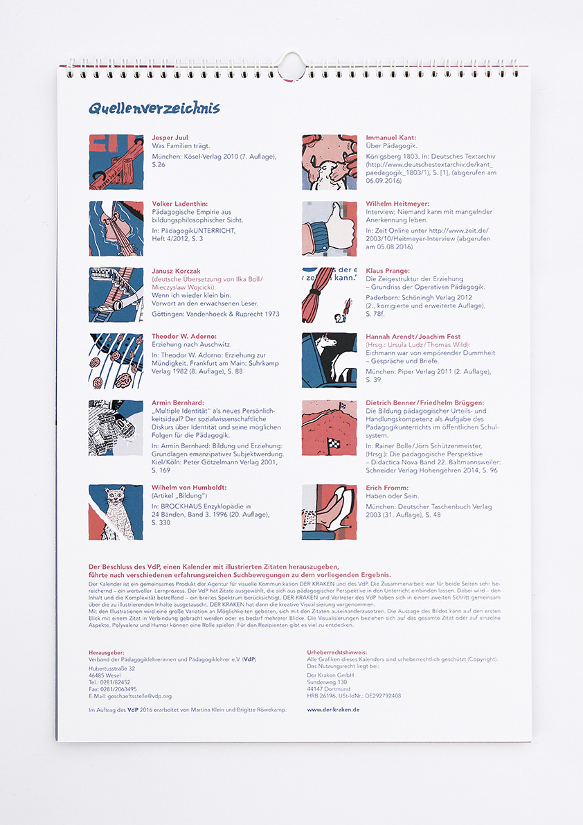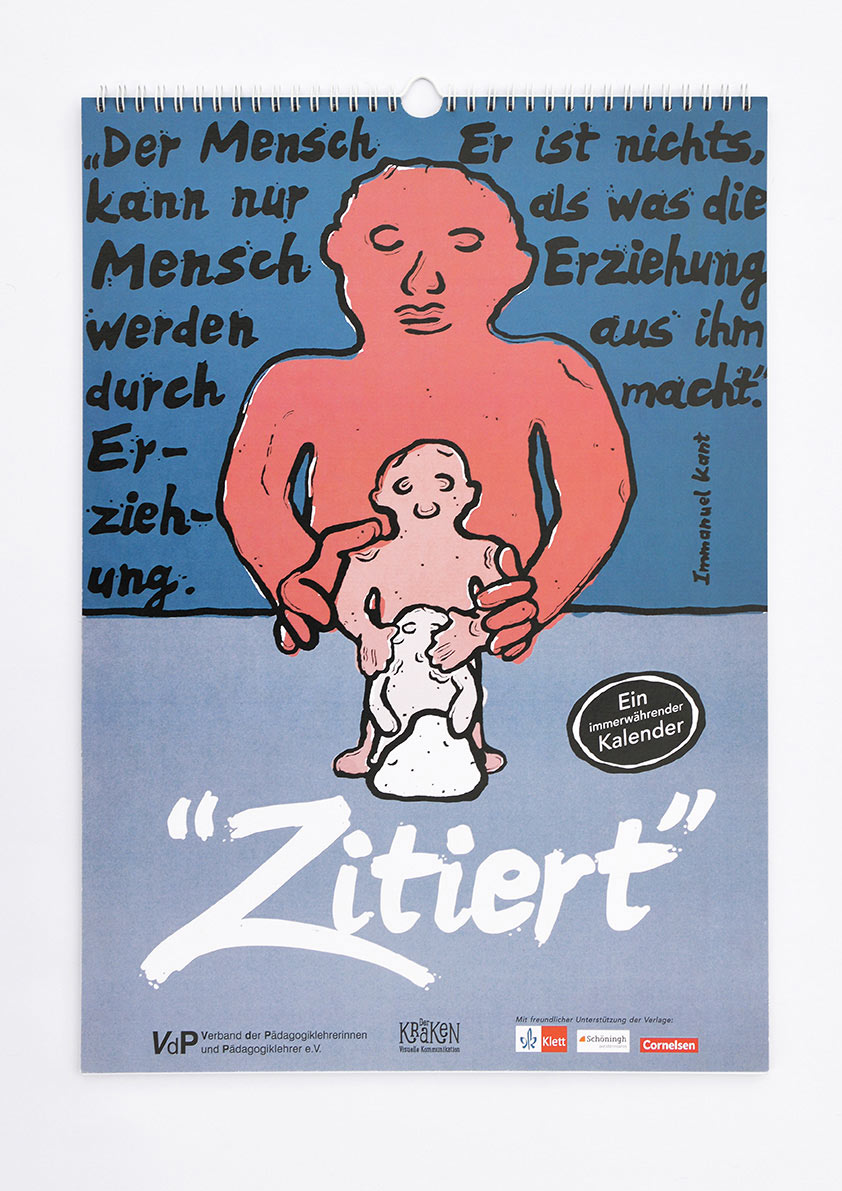 Der VdP (Verband der Pädagogiklehrerinnen und Pädagogiklehrer) hat uns beauftragt einen immerwährenden Kalender zu entwerfen. Das Thema: Prägnante Zitate aus dem Pädagogikbereich. Anwendung: Diskussionsgrundlage für den Pädagogikunterricht. Nach Sichtung des vorhandenen Materials haben wir beschlossen neue Illustrationen zu entwickeln, um eine einheitliche Bildsprache zu schaffen. Spannend wurde es, als wir anfingen uns mit den einzelnen Zitaten auseinander zu setzen. Manchmal gelang es uns ganz schnell die passenden Bilder zu den Texten zu finden, bei anderen Zitaten gab es Klärungsbedarf. Die Zusammenarbeit hat uns sehr inspiriert und unsere Gehirnwindungen zur Höchstleistung herausgefordert. Zitiert – Ein Kalender für immer